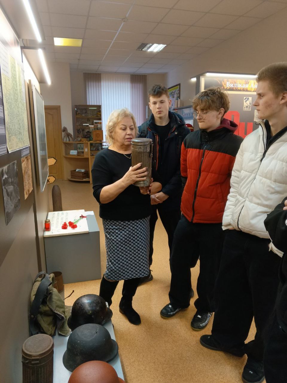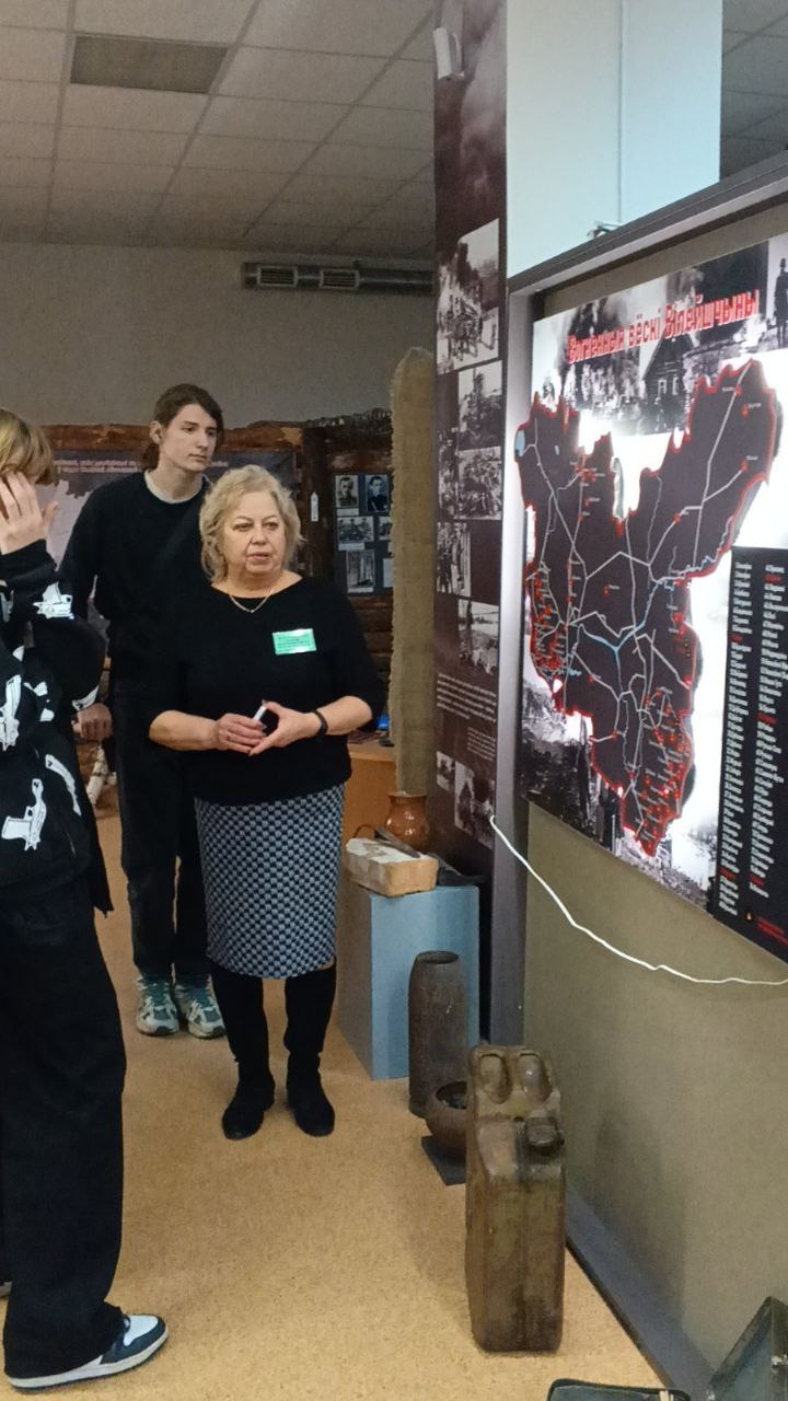 Экспозиция музея погрузила ребят в трагические страницы истории, связанные с оккупацией Вилейки. Молодёжь увидела материалы расследования злодеяний, совершённых бывшими служащими Главного Управления отделения СД, включая копии фотографий и схемы расположения гетто.
